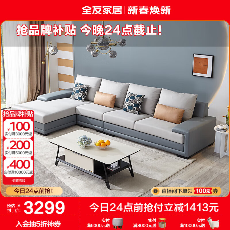 全友家居 客厅布艺沙发现代简约北欧家用贵妃科技布沙发家具102085价格:4712.86元!
