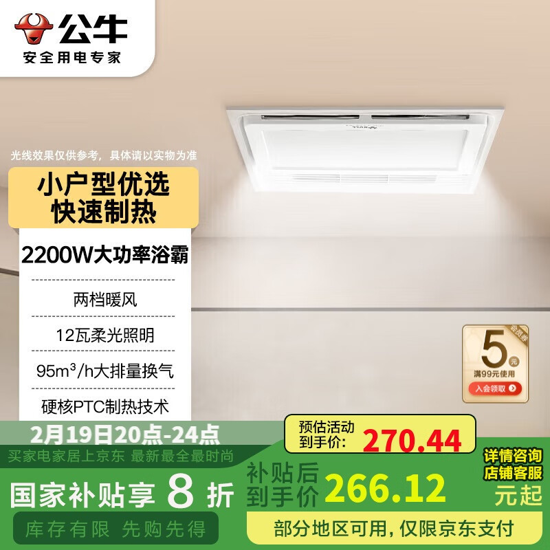公牛(BULL)浴霸GY12AJG小户型两档暖风2200W风暖+40W吹风+31W换气+12W照明价格:318.16元!