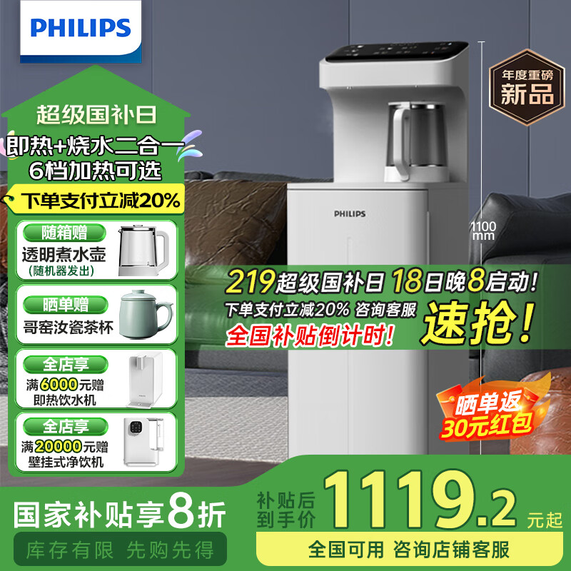飞利浦茶吧机家用立式饮水机 即热式饮水机 制热调温下置水桶高端客厅办公室多功能直饮水机ADD8148价格:1399.00元!
