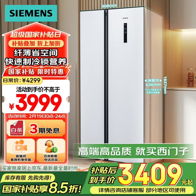 西门子(SIEMENS)502升变频无霜对开门冰箱 家电补贴以旧换新 双开门家用大容量长效保鲜超薄嵌入白KA50NE20TI价格:4199.00元!