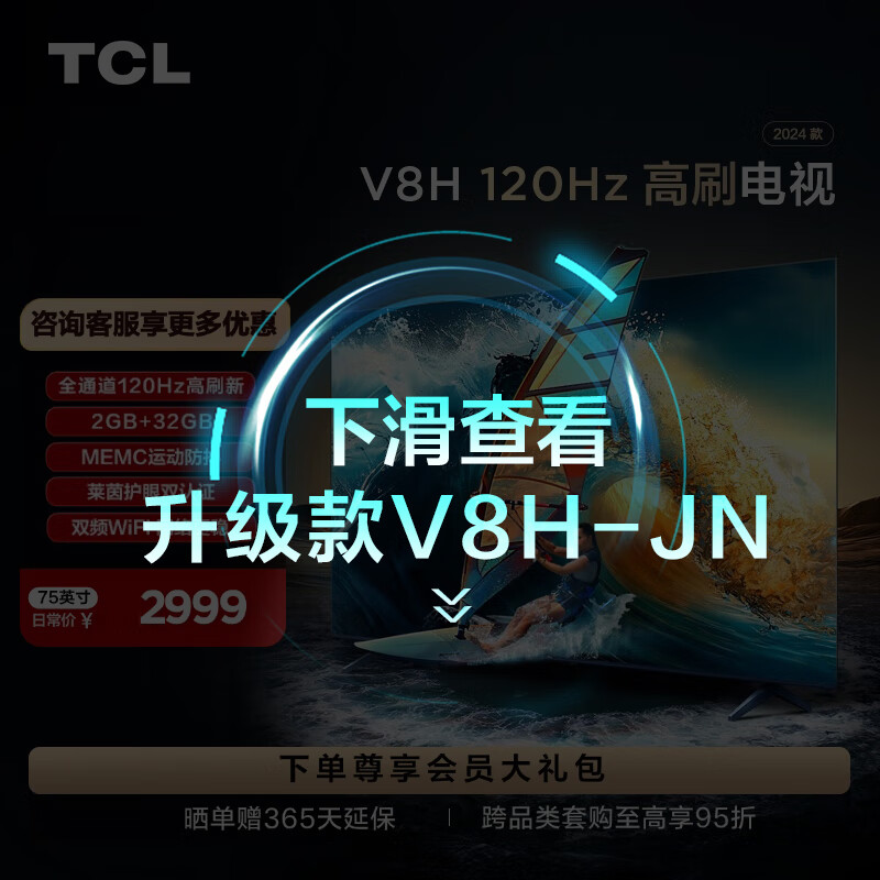 TCL电视 75V8H 75英寸 120Hz MEMC 2+32GB大内存 护眼 4K超高清 客厅液晶智能平板游戏电视机价格:2999.00元!