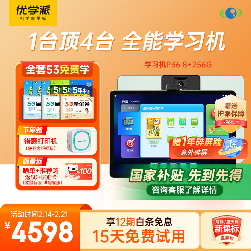 优学派P36纳米仿生屏学习机12.2英寸 AI护眼学生平板电脑 小学中学全科全龄段英语学习家教点读机价格:4598.00元!