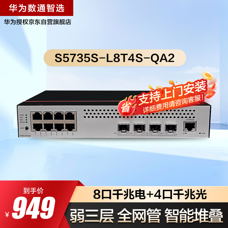 华为数通智选S5735S-L8T4S-QA2(A1)全千兆交换机8口千兆电口+4口千兆光纤口弱三层网管网络网线交换器价格:949.00元!