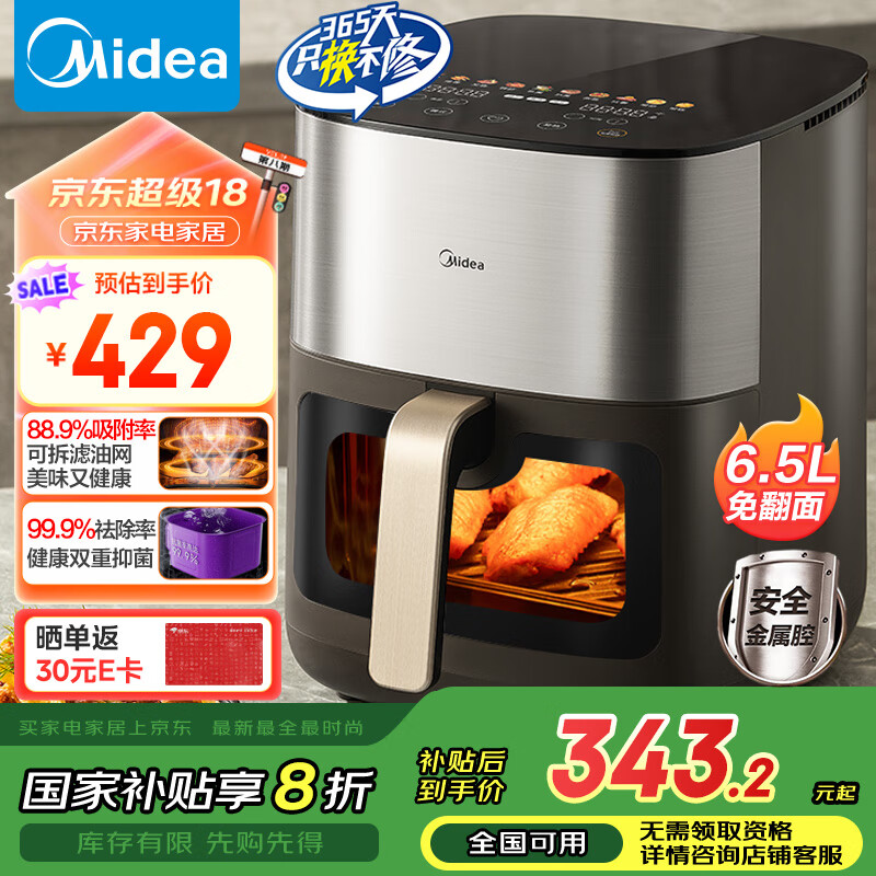 美的(Midea)炎烤空气炸锅 不用翻面 双热源 家用全自动 可视 实用大容量 智能 6.5L KZC6502价格:429.00元!