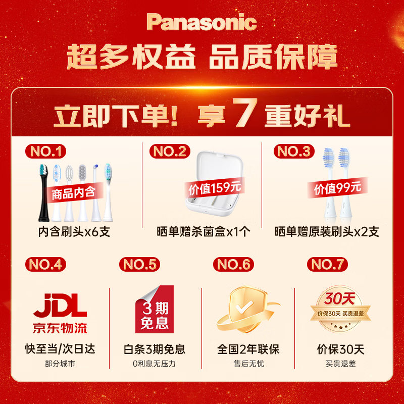5、活动时购买的,价格还行。之前用着的也是松下的,用了6年,直到前段时间无法充电才换了这只,相比之前的款,这款动力更足,清洁力度即使是Soft模式也很给力,还可以匹配我之前囤的牙刷头,总体很nice.!