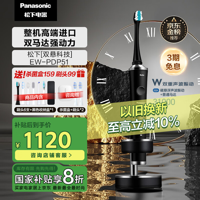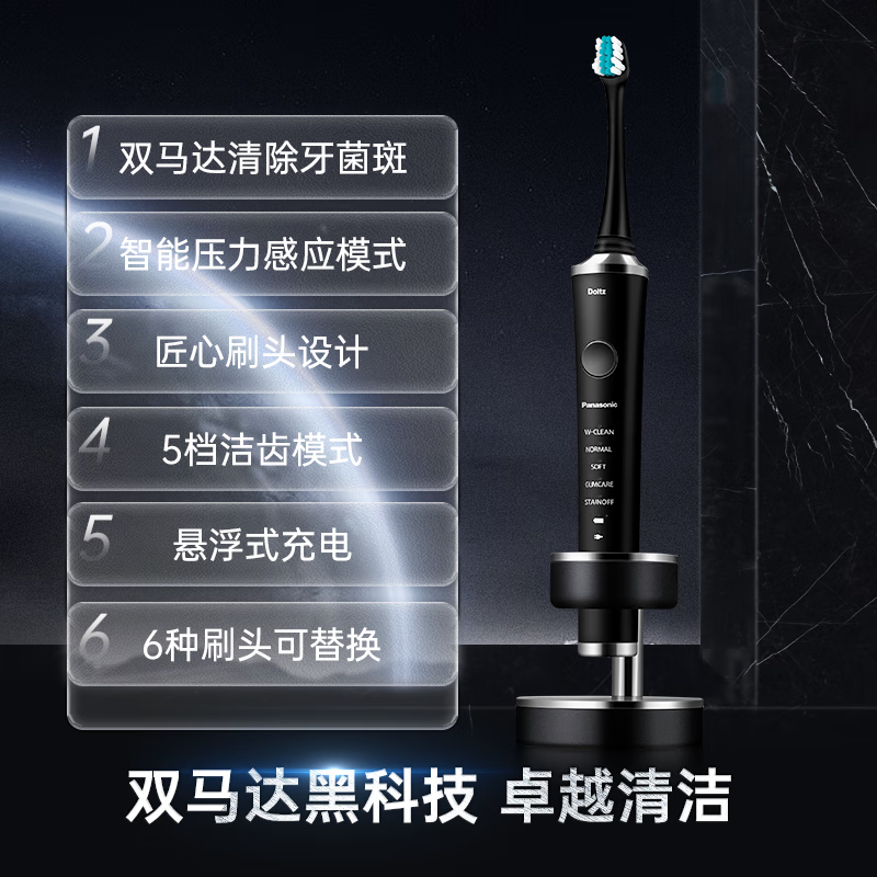 松下(Panasonic)电动牙刷牙医推荐高端整机进口科技双马达声波震动智能感应情人节礼物送男友送女友PDP51黑色价格:1399.00元!
