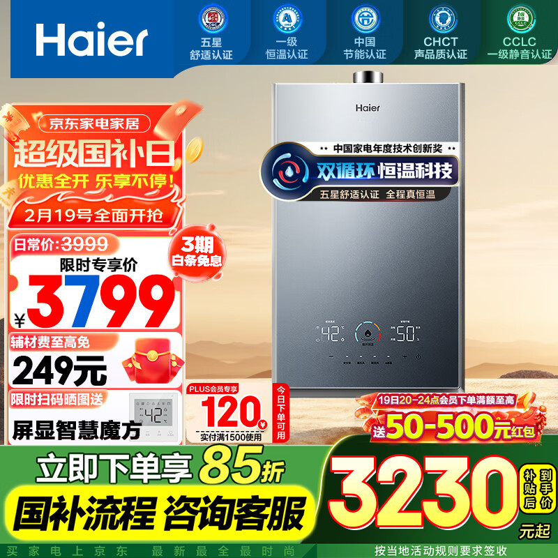 海尔(Haier)16升【国补换新立减15%】【恒星KL7S】燃气热水器天然气双循环恒温TSI增压静音JSQ31-16KL7SFPAGU1价格:3799.00元!