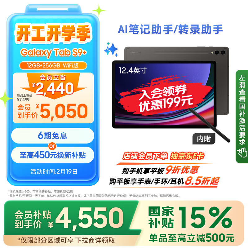 三星 Samsung【政府补贴】S9+ 12.4英寸平板电脑/AI智享学习办公/骁龙8Gen2 12G+256GB 云影灰WIFI价格:5249.00元!