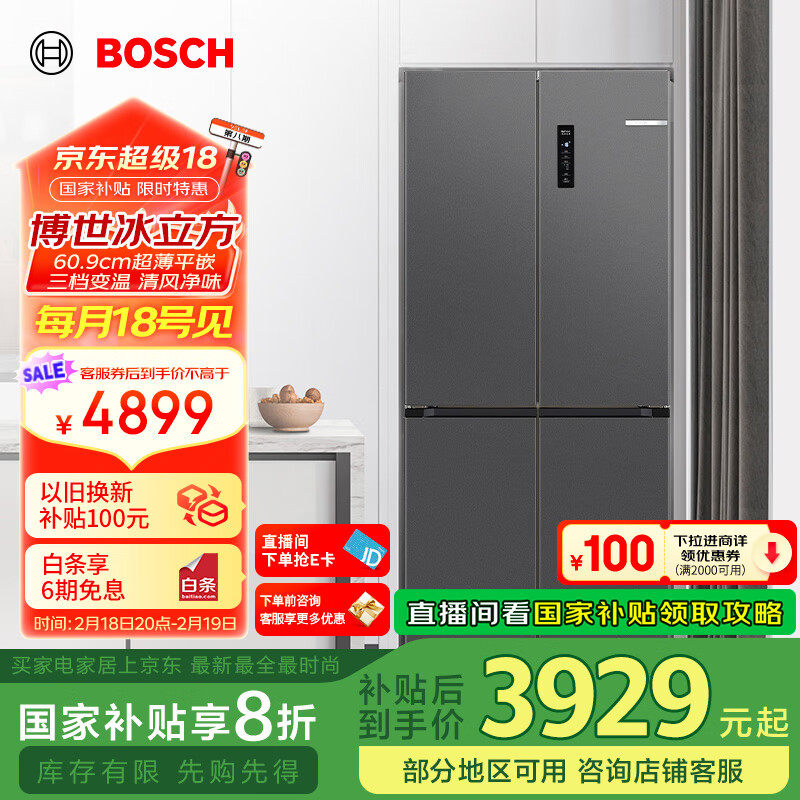 博世(BOSCH)【冰立方】497升十字对开四门超薄微平嵌入式冰箱 补贴20%冰箱 净味变温一级能效K1EC49788C价格:5299.00元!