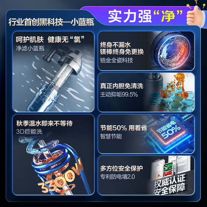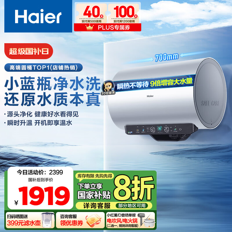 海尔(Haier)60升补贴电热水器3D巨能洗小蓝瓶净水洗瓷净瞬热美肤家用储水式3.3kW速热大水量EC6005-JE7KU1价格:2399.00元!