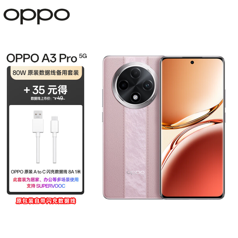 OPPO A3 Pro 12GB+256GB 云锦粉 耐用战神 满级防水 360°抗摔 大电池 5G手机【数据线备用套装】价格:2034.00元!
