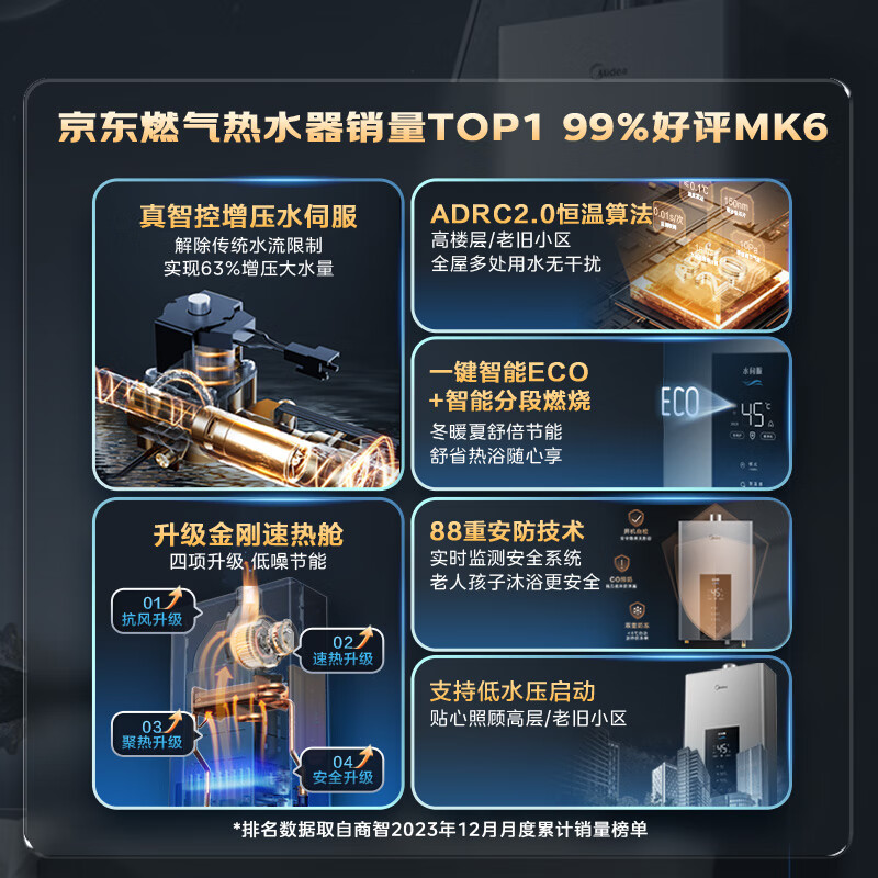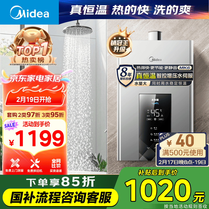 美的(Midea)16升燃气热水器天然气智控增压水伺服恒温【国补立减15%】 ECO节能 低水压启动JSQ30-MK6耀夜价格:1199.00元!