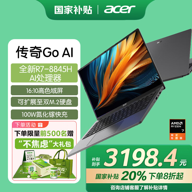 宏碁(acer)传奇Go AI大算力 14英寸轻薄本 商务办公学生全能笔记本电脑(全新锐龙R7-8845H 16G 1TB 100%sRGB)价格:3994.00元!