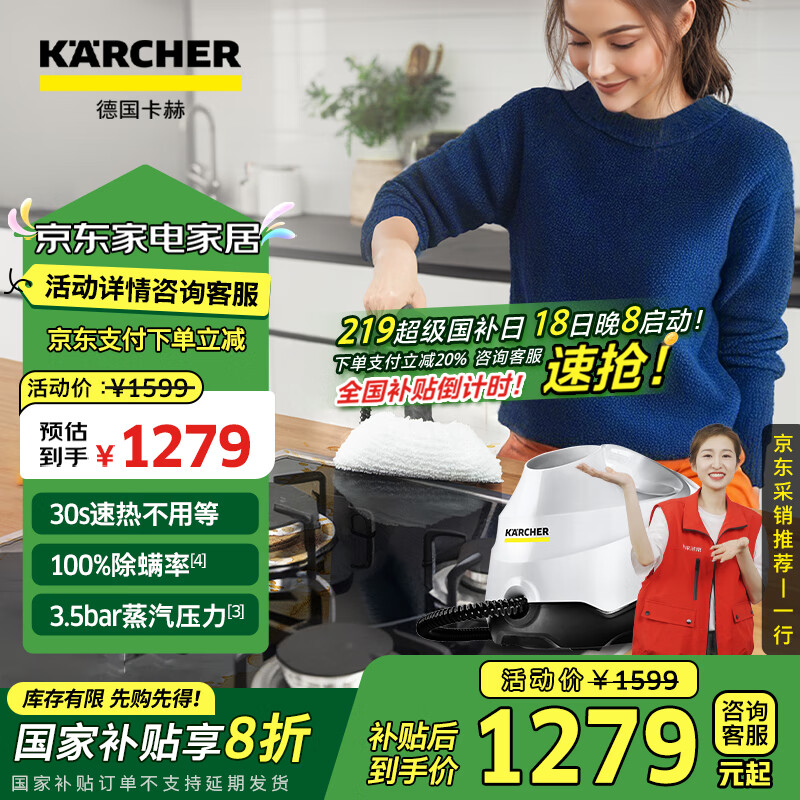 KARCHER德国卡赫 补贴蒸汽拖把家用高压高温清洁机厨房油烟机清洗机去油污30秒速热洗地机杀菌消毒SC3价格:1599.00元!