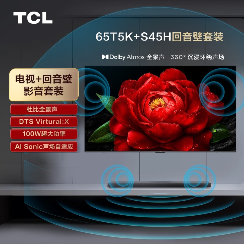 TCL音响版本-65T5K 65英寸 剧院量子点电视 T5K+杜比全景声回音壁 S45H价格:3098.00元!