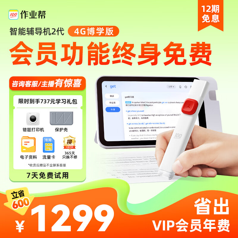 作业帮【限时赠错题打印机】AI智能辅导机2 学习机词典笔二合一 原题视频精讲全科辅导8英寸AG护眼屏价格:1249.00元!