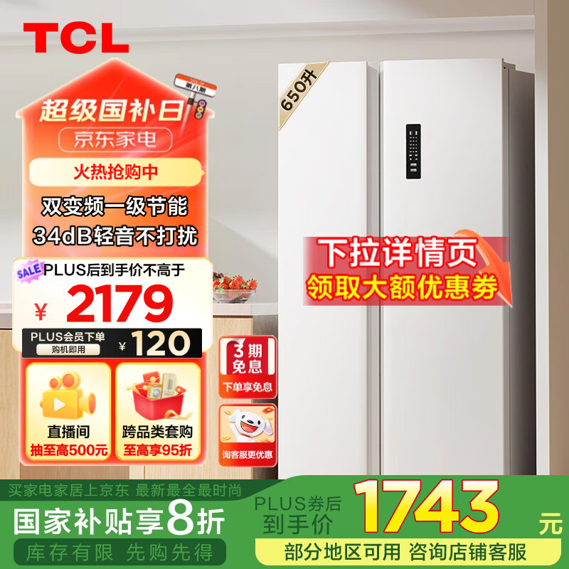 TCL650升T5超大容量对开双开门多门白色冰箱一级能效风冷无霜一体双变频家用电冰箱补贴R650T5-S价格:2099.00元!