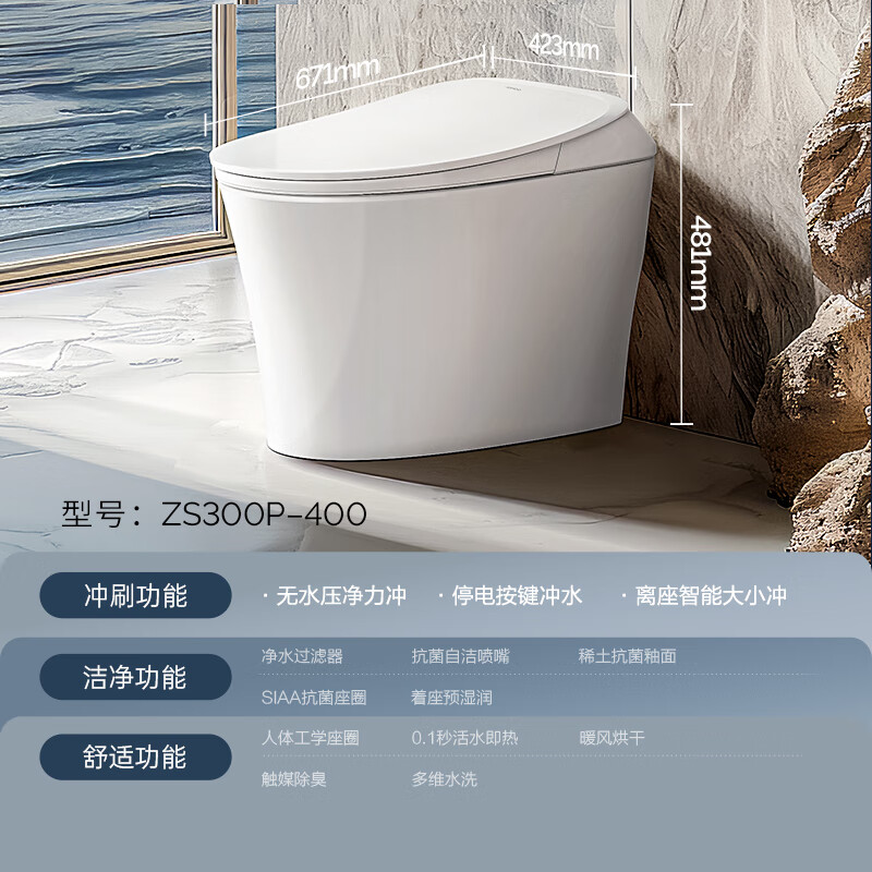 功能:暖风烘干,抗菌,自动除臭,停电冲水,离座冲水,漏电保护,按摩清洗,臀部清洁,座圈加热,喷嘴自洁,女性清洗,喷嘴移动清洗,净化水质,水温调节,风温调节,坐温调节,柔和夜灯