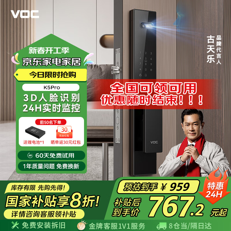 VOC智能门锁指纹锁密码锁电子智能锁入户门人脸识别家用K5Pro价格:959.00元!