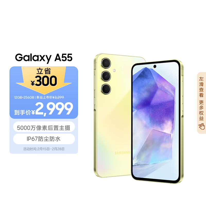 三星Samsung Galaxy A55 5000万像素 拍照手机 5000mAh 长续航手机 5G游戏手机 12GB+256GB 柠柚黄价格:2999.00元!