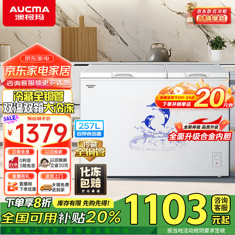 澳柯玛(AUCMA)257升家用冰柜 大冷冻小冷藏卧式双温冰柜 小型冰箱双温冷柜 一级能效 BCD-257CHN以旧换新价格:1399.00元!