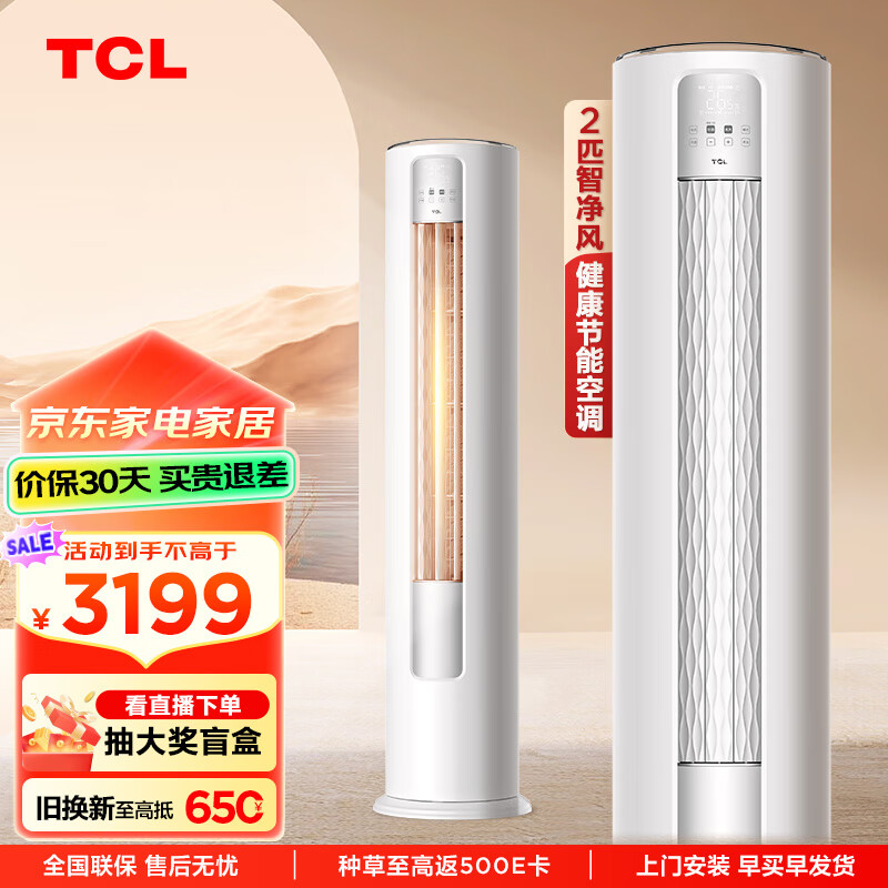 TCL空调 2匹 新三级能效 变频冷暖 智净风除菌 客厅空调立式 空调柜机KFR-51LW/JV2Ea+B3 以旧换新价格:3199.00元!