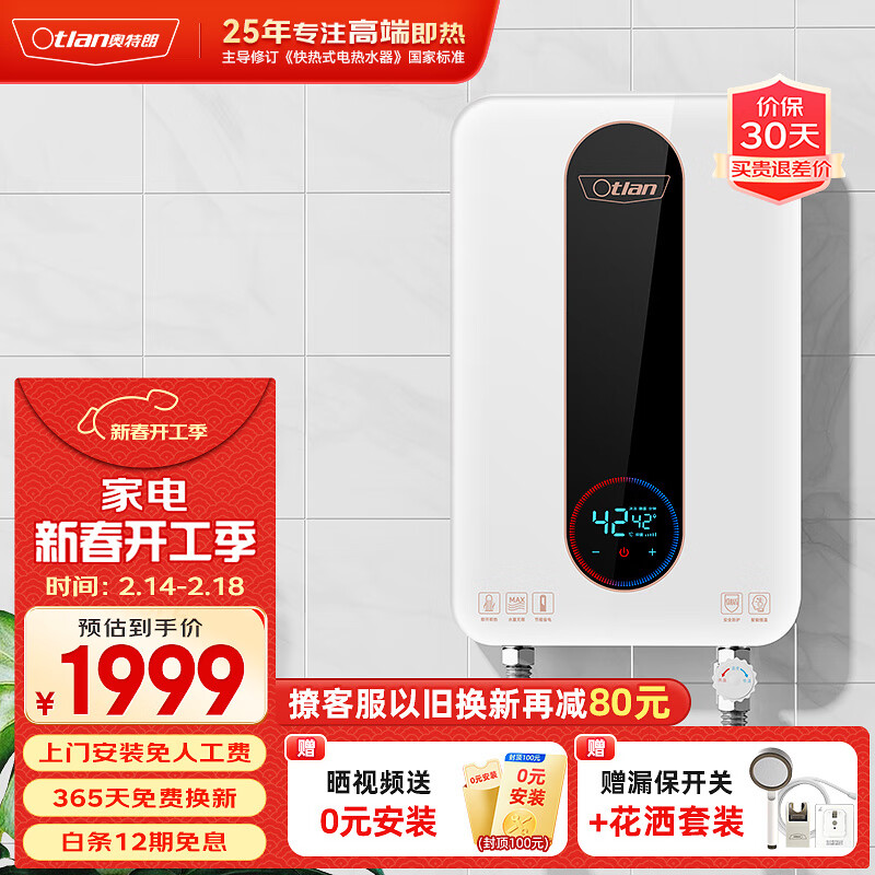 奥特朗(otlan)F17S-Z85B 即热式电热水器 家用小型速热免储水 快热式恒温淋浴机【0-8.5KW智能变频】价格:1999.00元!