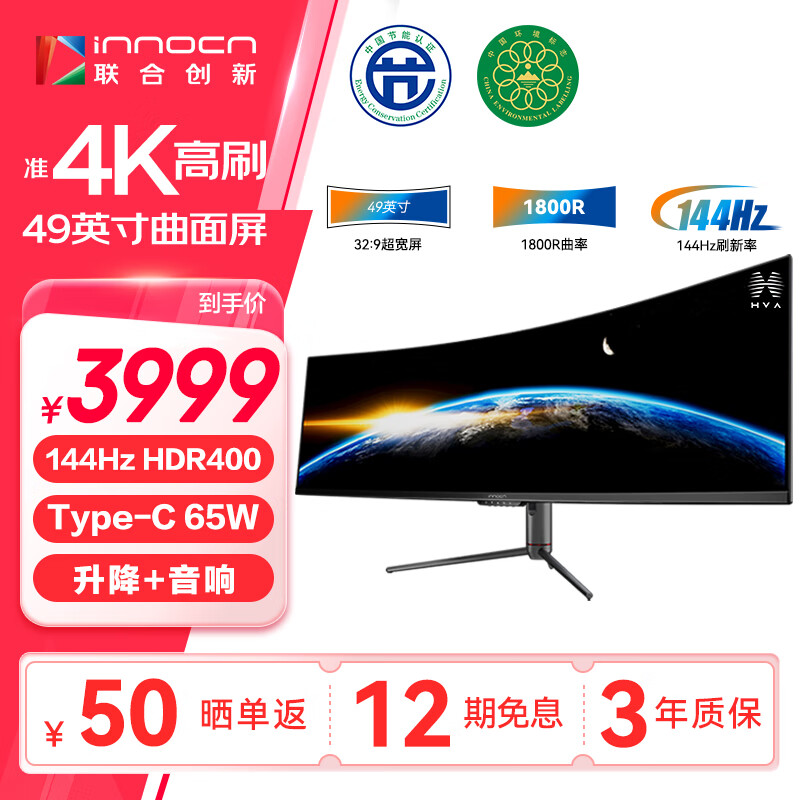 联合创新49英寸准4K曲面屏144Hz 32:9双显多功能带鱼屏 出厂校色 游戏电竞办公设计炒股显示器 49C1G价格:4699.00元!