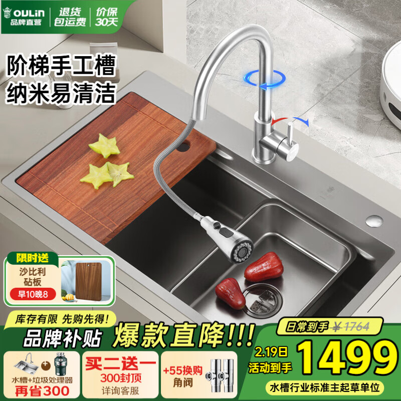 欧琳(OULIN)水槽大单槽洗菜盆厨房304不锈钢纳米手工槽9140H价格:1764.00元!