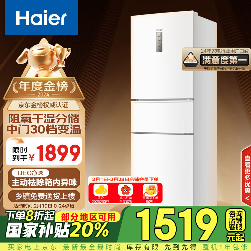 海尔(Haier)255升风冷无霜三开门多门电冰箱小型家用宿舍出租房一级能效BCD-255WLHC35EWVU1家电补贴20%价格:1799.00元!