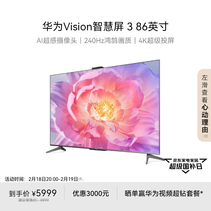 华为Vision智慧屏 3 86英寸 Mate 70投屏好搭档 240Hz高刷 超高清智能液晶游戏平板电视机85寸HD86QINA价格:5699.00元!