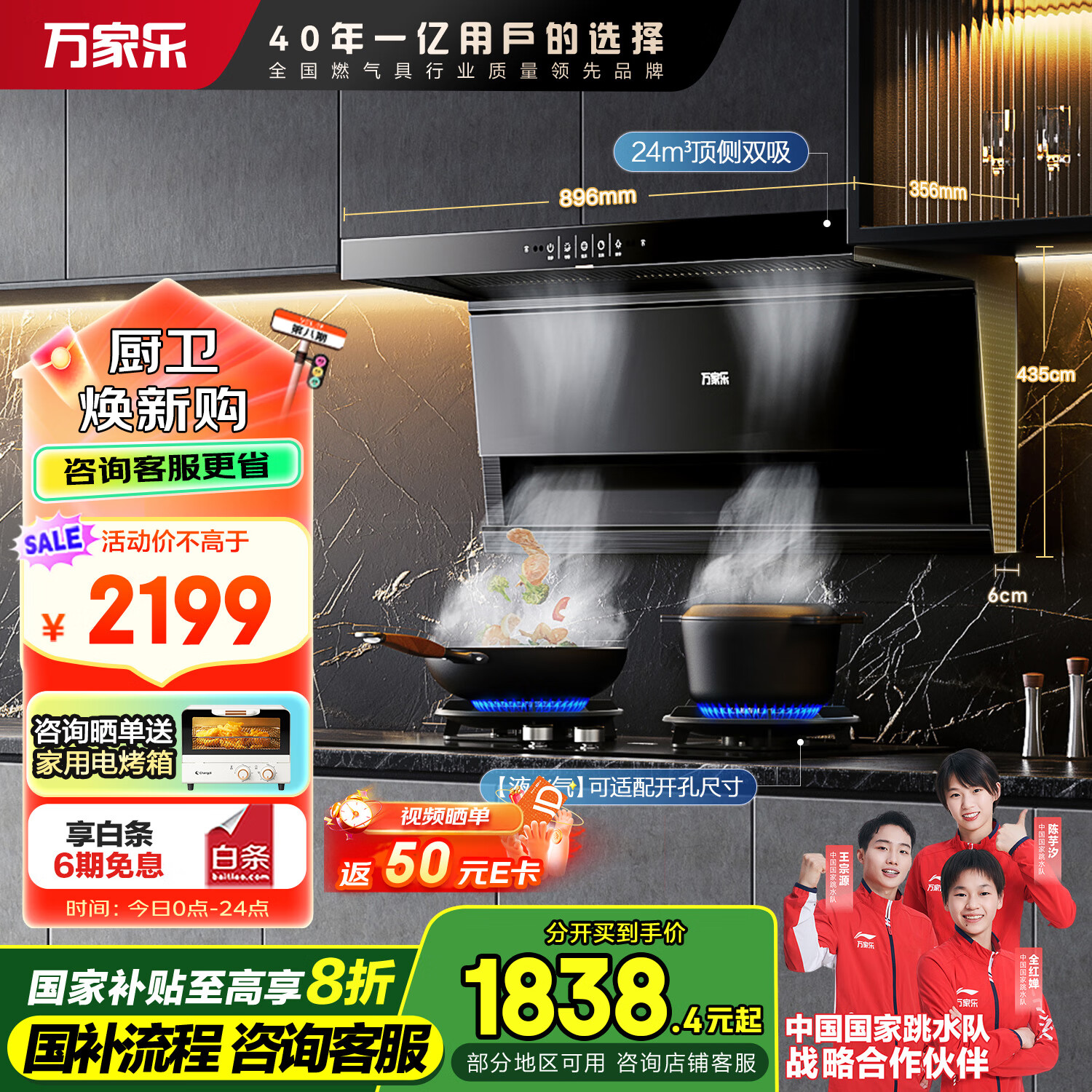 万家乐顶侧双吸油烟机 24立方抽油烟机灶具套装 68%高热效率灶具 家用挥手自清洗烟灶套装TAK5+AY6液化气价格:2199.00元!