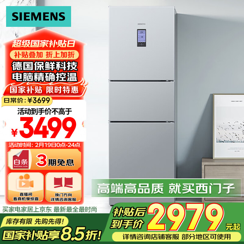 西门子(SIEMENS)306升风冷无霜三门家用冰箱 家电补贴以旧换新 三开门 大容量 锁水保鲜 双效过滤 KG32HA26EC价格:3499.00元!
