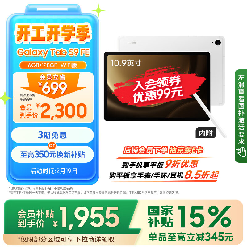 三星 Samsung【政府补贴】S9 FE 10.9英寸平板电脑/护眼大屏/含S Pen 6+128GB 星系银WIFI价格:2399.00元!