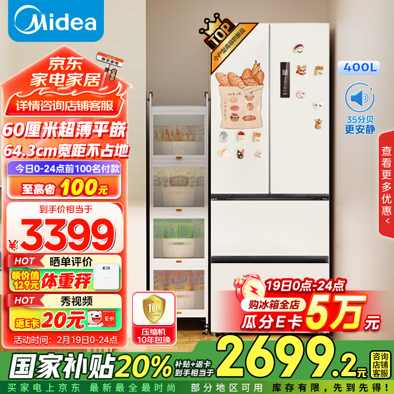 美的(Midea)418法式多门四开门电冰箱超薄平嵌小户型家用冰箱一级能效大容量无霜MR-418WFPE白色补贴20%价格:3498.99元!