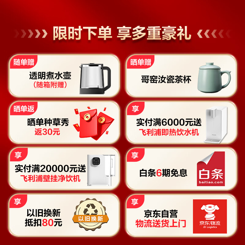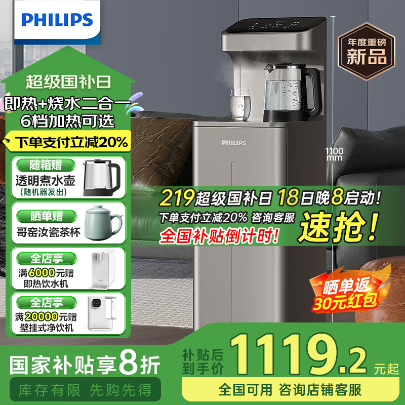飞利浦(PHILIPS)茶吧机家用立式饮水机 即热式饮水机 下置水桶双出水高端客厅办公室多功能直饮水机ADD8144价格:1399.00元!