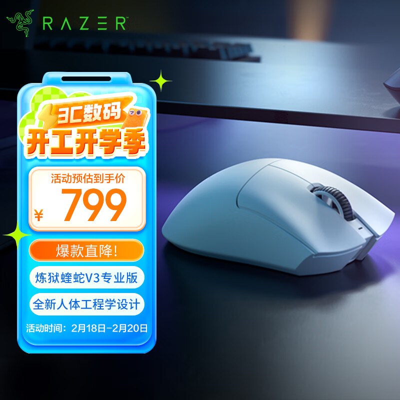 雷蛇(Razer)炼狱蝰蛇V3pro专业版无线鼠标 电竞游戏 轻量化 人体工学 白色(赠防滑贴+Type-C充电接口)价格:799.00元!