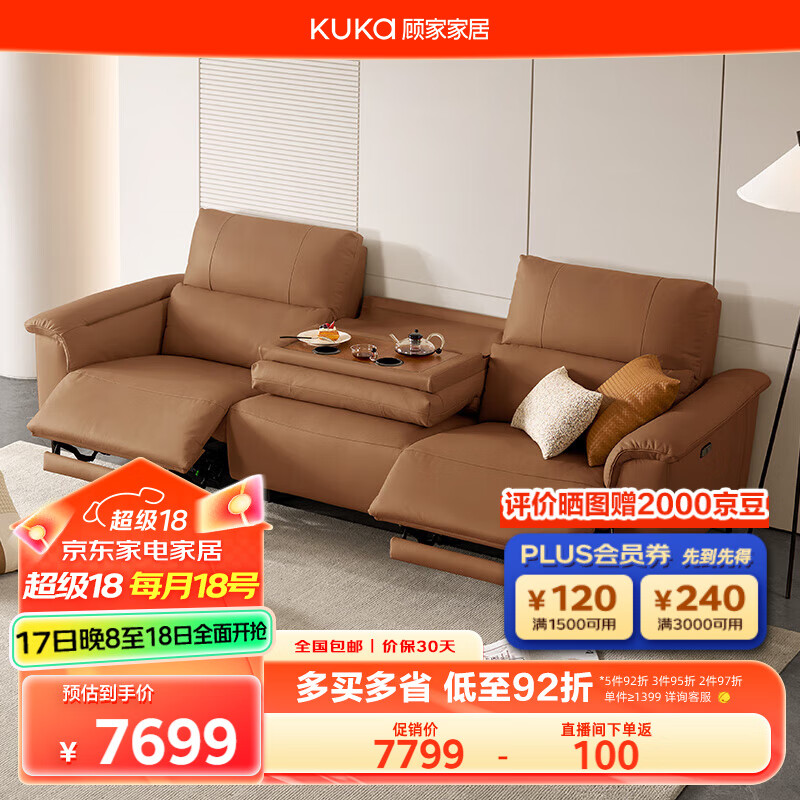 顾家家居(KUKA)零靠墙现代功能皮沙发客厅6196纳帕【米勒棕】3人2电动带翻倒几价格:7799.00元!