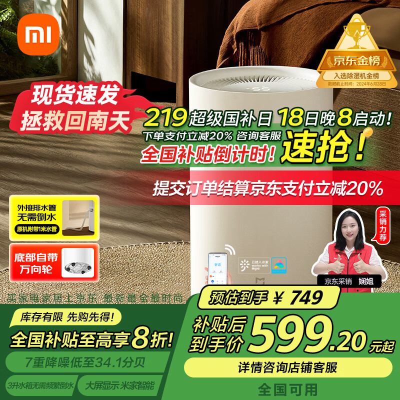 米家小米除湿机家用抽湿机除湿器除湿量13L/天 7重降噪 卧室轻音 除潮空气 干衣机 DM-CS13BFA5A价格:749.00元!