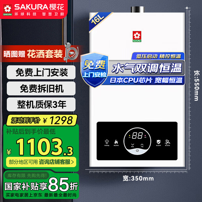 樱花(SAKURA)【补贴至高15%】燃气热水器天然气16L水气双调日本CPU智能精控恒温低压启动JSQ30-JJP002S价格:1298.00元!