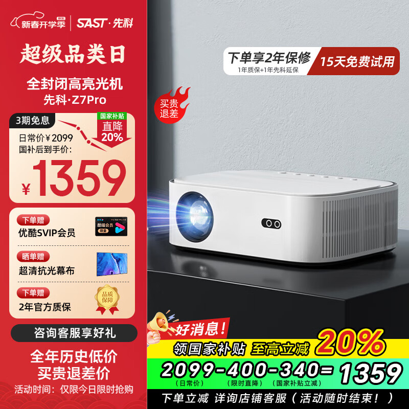 先科(SAST)Z7Pro投影仪家用家庭影院超清办公投影机(自动对焦自动校正1600ANSI流明手机无线投屏 )价格:1689.00元!