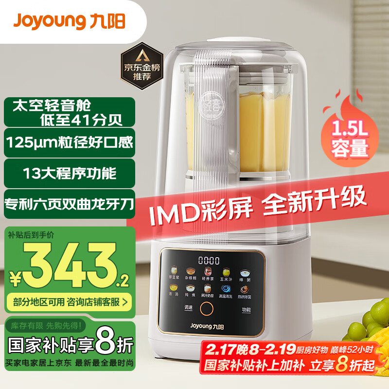 九阳(Joyoung)太空轻音舱41分贝1.5L破壁机3-4人用全自动家用豆浆机降噪榨汁机料理机P939太空系列【补贴】价格:429.00元!