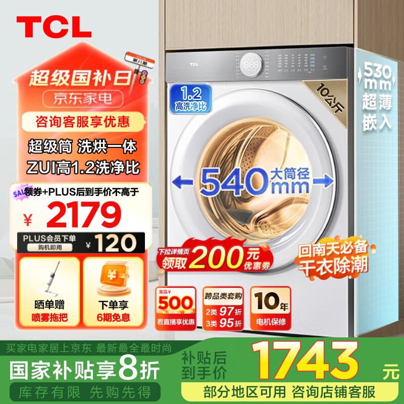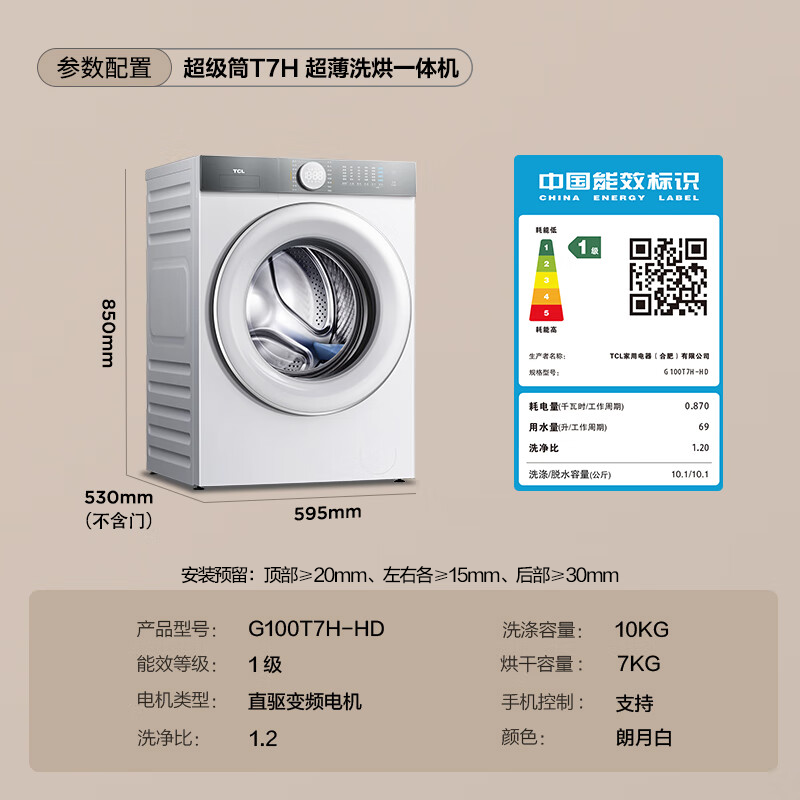 TCL?10公斤超级筒T7H超薄带烘干洗烘一体滚筒洗衣机1.2洗净比全自动家电补贴以旧换新G100T7H-HD价格:2499.00元!