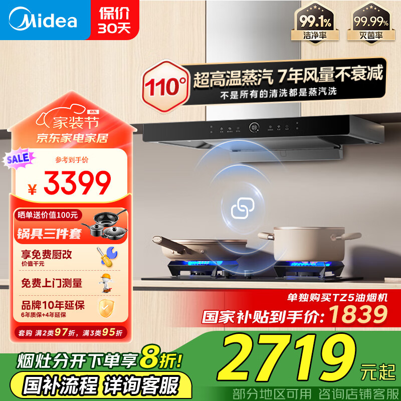 美的(Midea)抽油烟机23风量欧式自清洁蒸汽洗防干烧5.2kW灶具烟灶联动套装TZ5+Q230S-L天然气国补以旧换新价格:3299.00元!