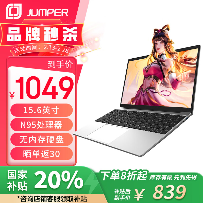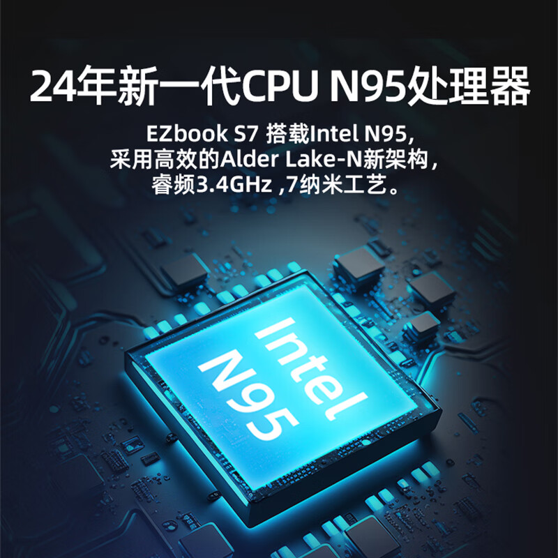 中柏(Jumper)15.6英寸商务办公学习网课笔记本电脑(英特尔N95处理器/无内存/无硬盘)EZbookS7价格:1049.00元!