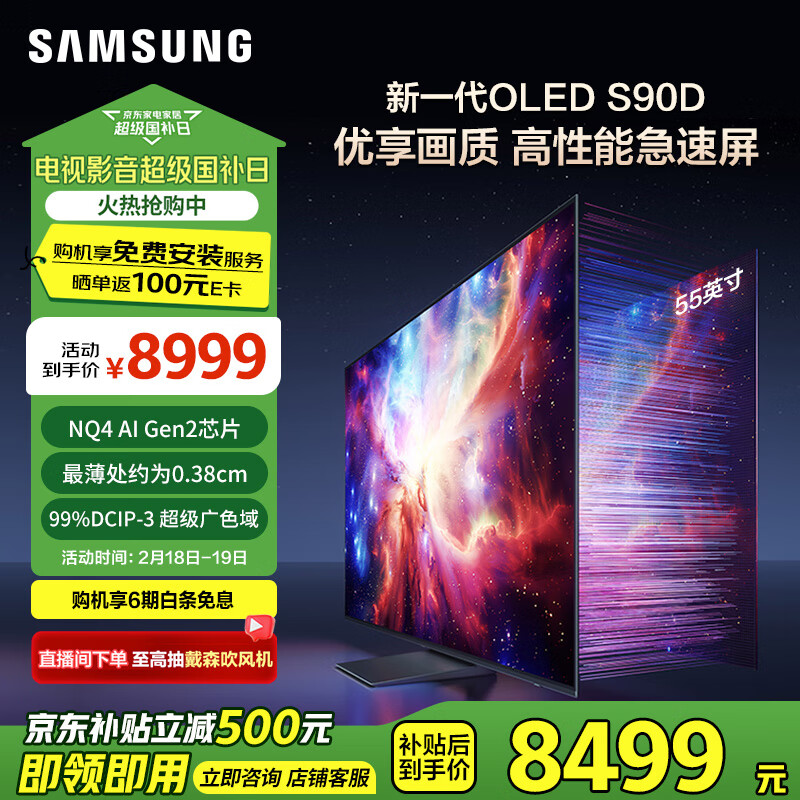 三星(SAMSUNG)55S90D 55英寸 OLED游戏电视 AI电视 超薄4K 144Hz 屏 无开机广告 QA55S90DAJXXZ价格:8999.00元!