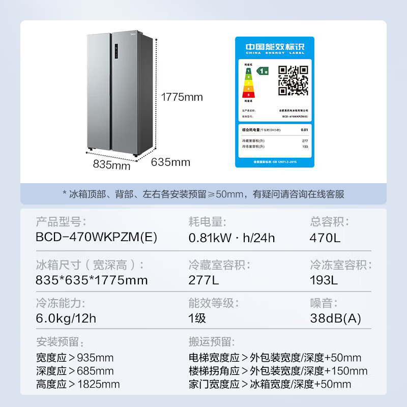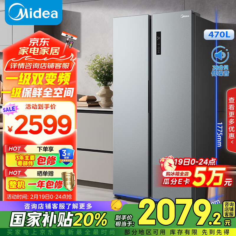 美的(Midea)470升双开门对开门变频一级能效节能风冷无霜超薄智能家用电冰箱补贴BCD-470WKPZM(E)价格:2599.00元!