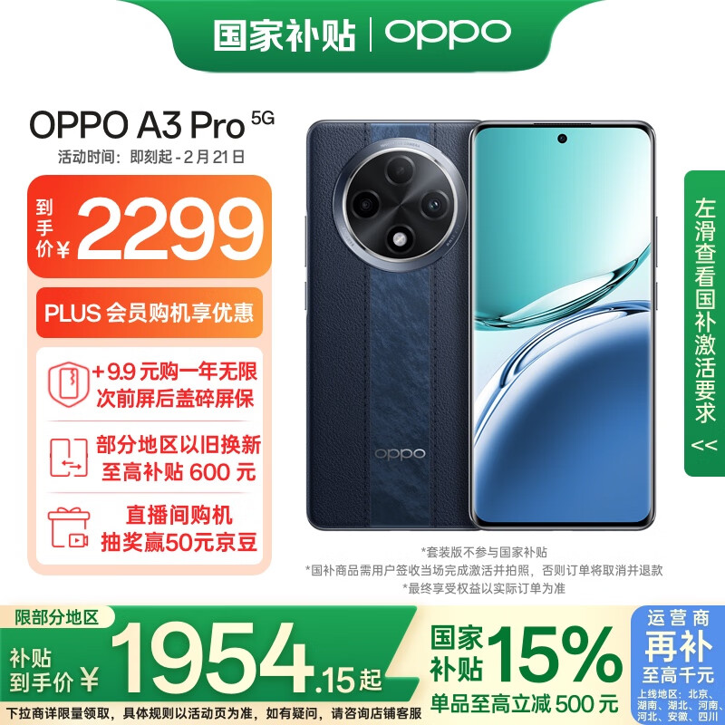 OPPO A3 Pro 12GB+512GB 远山蓝 5G 政府补贴 耐用战神 满级防水 360°抗摔 超抗摔护眼屏 智能AI手机价格:2299.00元!