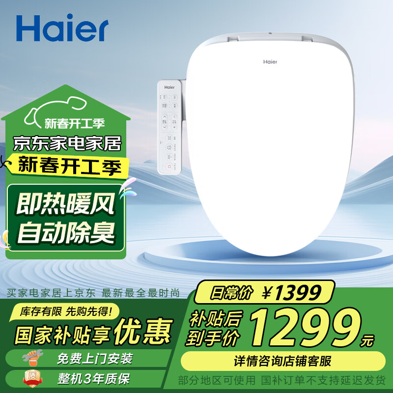 海尔(Haier)智能马桶盖 即热暖风座圈加热等离子杀菌自动除臭 智能坐便盖VE价格:1399.00元!