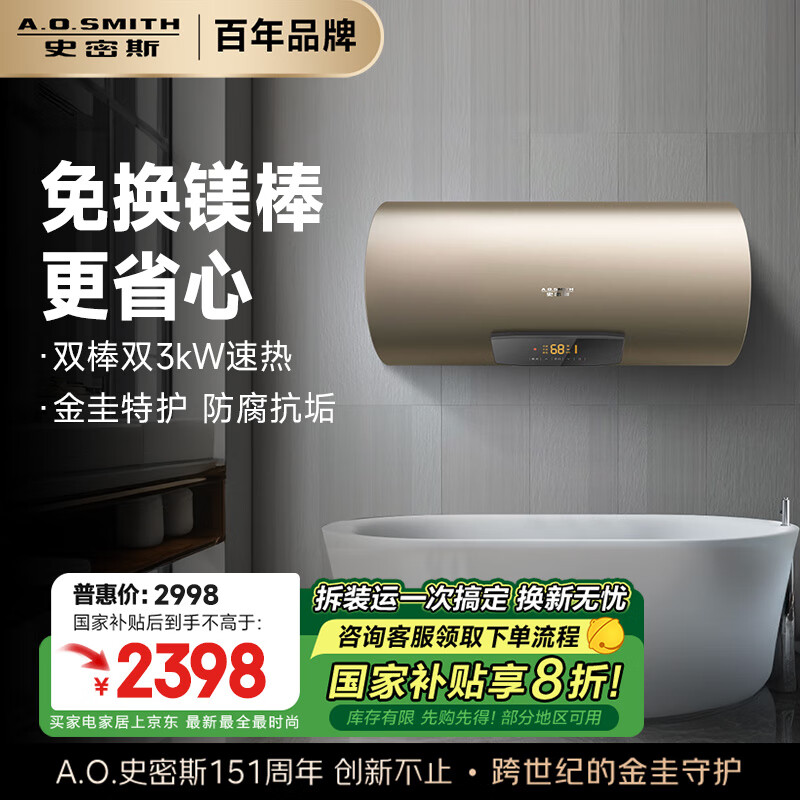 史密斯(A.O.SMITH)60升电热水器 补贴 终身免更换镁棒 金圭内胆 双棒双3kW速热 晶彩外观 遥控E60MDF价格:2998.00元!